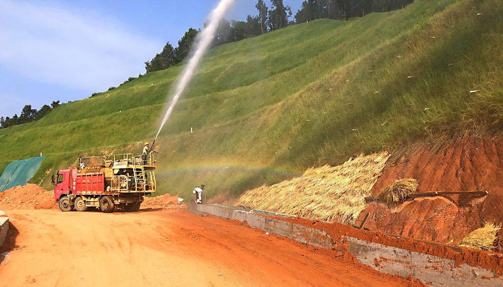 新建猇亭服務(wù)區(qū)路塹邊坡綠化防護(hù)優(yōu)化工程項(xiàng)目-右場坪高邊坡-濕噴機(jī)噴播、噴播車噴播↓